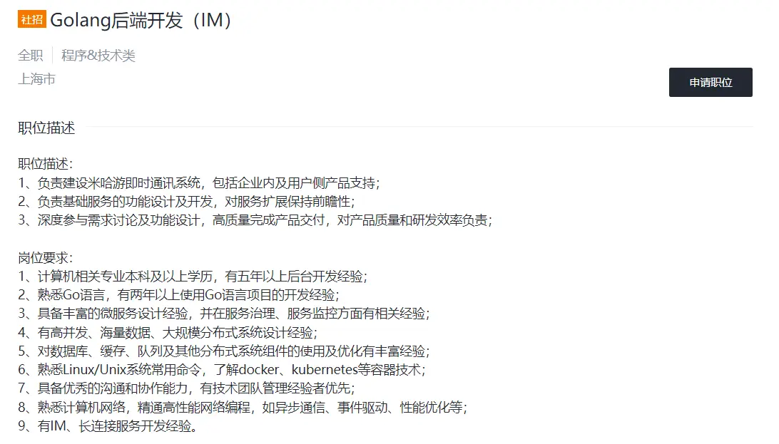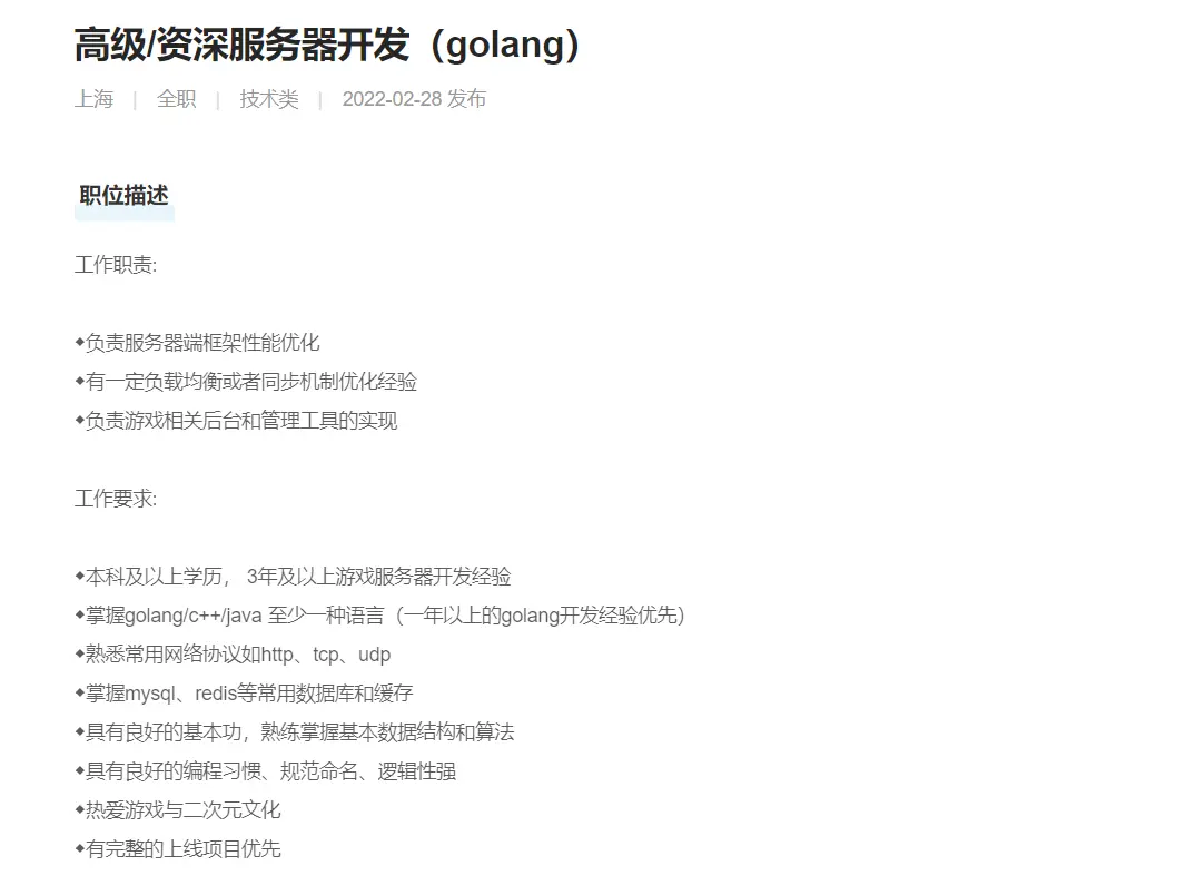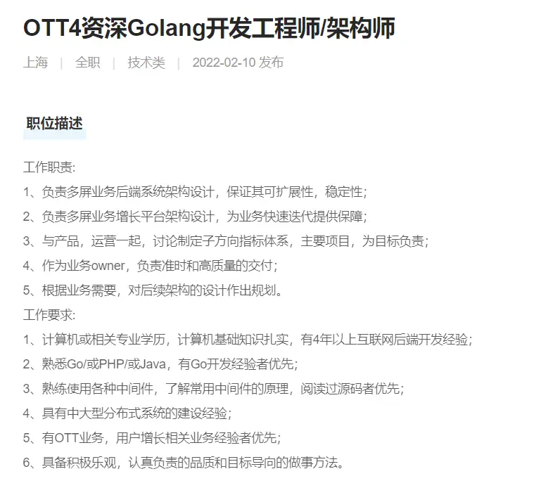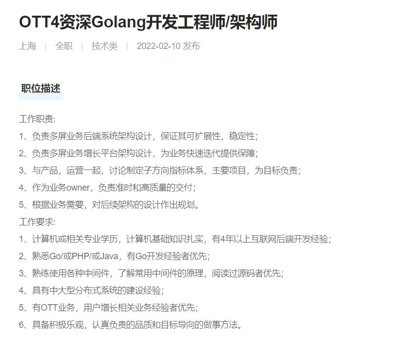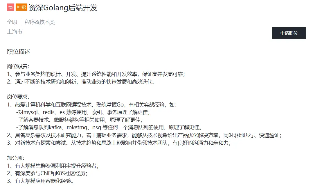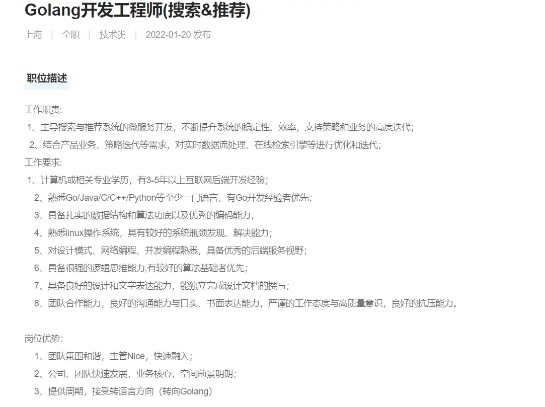 本文档主要记录go工程师招聘要求